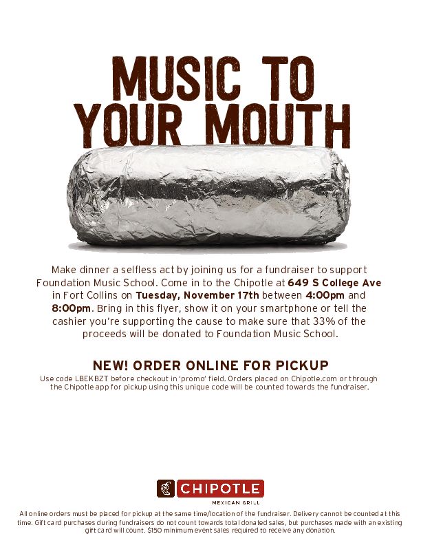 Join us at the Chipotle at 649 S College Ave in Fort Collins on Tuesday, November 17th between 4:00pm and 8:00pm.